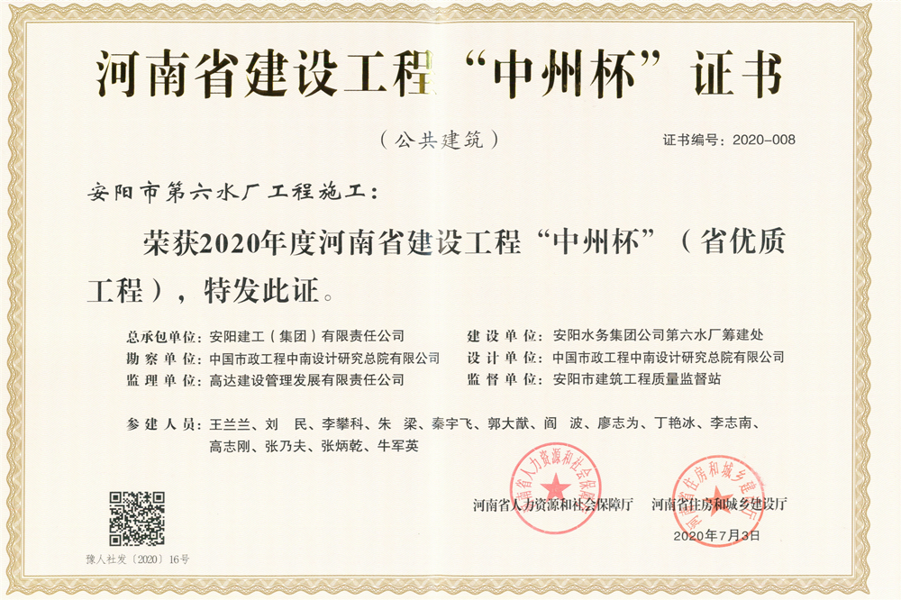 由我公司承建的“安陽市第六水廠”、“安陽市第四水廠二期”、“安陽攀高教育園區(一期)”工程被評為2020年度河南省建設工程“中州杯”獎。