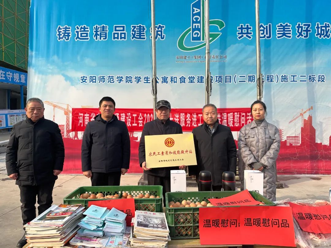 12月27日,河南省農業交通建設工會“十送服務進工地”送溫暖慰問活動深入到安陽建工集團師范學院公寓樓項目部,為大家送來了溫暖慰問品、安全知識手冊、藥品板藍根、文化書籍等,受到項目部一線職工的歡迎和感謝。安陽市總工會四級調研員苗廣軍、安陽市城建交通水利工會主席梁曦等一行領導親手將“溫暖、安全、健康、文化”送到一線員工手中,讓員工非常感動。公司工會主席馬松林同志對省農業交通建設工會、安陽市總工會長期以來給予安陽建工集團的關心、指導和幫助表示感謝,匯報了公司項目小家的建設情況和農民工素質和技能提升站的運行構思。