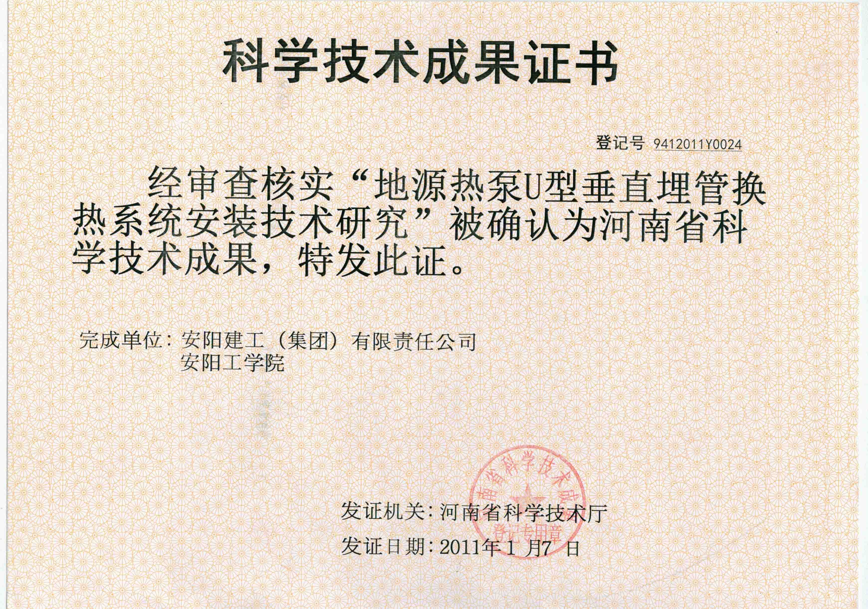 在集團公司領導支持下,技術中心開拓科技項目的申報等渠道,現已涉足申報一項安陽市重大科技攻關項目。2010年12月《地源熱泵U型垂直埋管換熱系統安裝技術研究》順利通過了市科技局組織的專家鑒定,2011年1月經河南省科學技術廳認定為“河南省科學技術成果”。目前該成果課題正在申報安陽市科技進步獎。