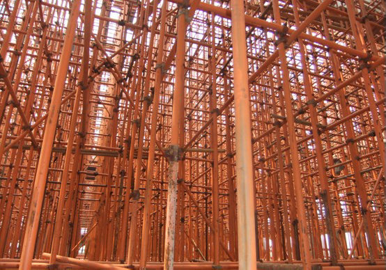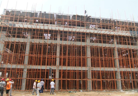 安陽建工邯鄲分公司承建的臨漳文化藝術中心項目,占地150畝,建筑面積13165平方米,計劃投資4500萬元,集大型會議中心、文化演藝中心、影視播放中心、群眾文化活動中心為一體。其中會議大廳跨度20米,高13.5米,長40米,附跨高度8.5米,建筑面積約2000平方米,結構施工為高支模系統,是本工程的難點和重點。施工前,公司工程部及技術中心組織了支模方案論證,并多次到現場指導施工,進行模板驗收,制定澆筑方案。7月15日進行砼澆筑,采用兩臺泵車,經過10個小時的澆筑,順利完成會議大廳結構施工。