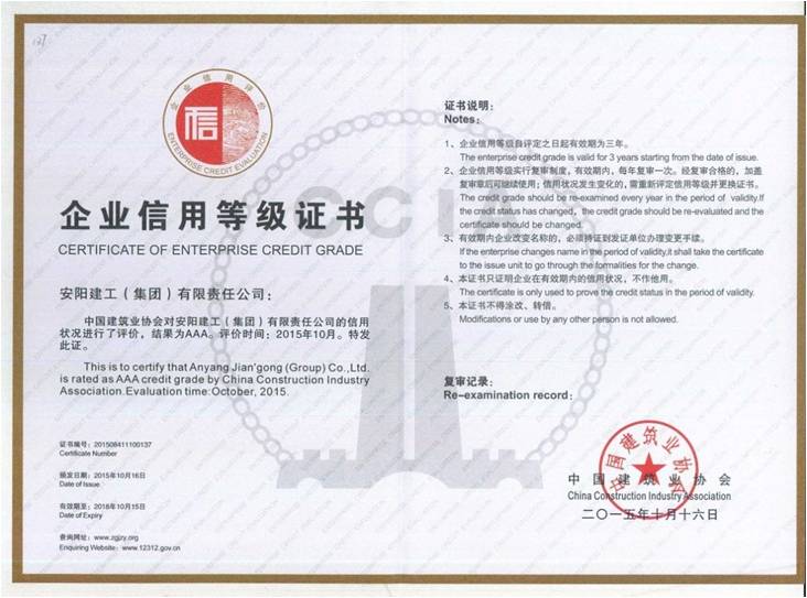 2016年1月7日,中國建筑業(yè)協(xié)會在珠海隆重召開全國建筑業(yè)AAA級信用企業(yè)暨中國建筑業(yè)雙百強企業(yè)發(fā)布會,向我公司在內(nèi)的共277家2015年度全國建筑業(yè)AAA級信用企業(yè)和榮獲2014年度雙百強的企業(yè)頒發(fā)獎牌和證書,我公司很榮幸的作為企業(yè)代表上臺領取了AAA級信用企業(yè)證書。 企管辦 侯艷芳