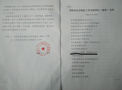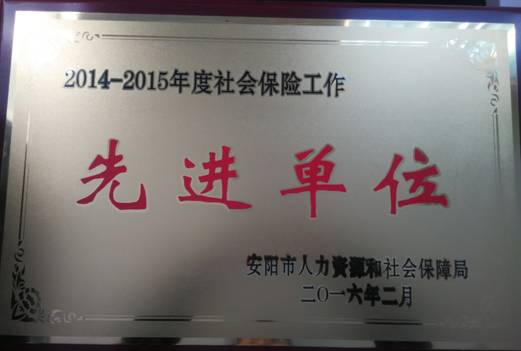 近年來,我單位社會保險工作政策認真貫徹國家和省、市各項相關政策、方針,主動適應經濟發展新常態,圍繞社會深化改革,完善社會保障體系建設,在我市社會保險工作中又一次取得新的成績,為促進社會經濟發展,維護社會穩定做出積極貢獻,在2014-2015年度社會保險工作中被評為“先進單位”,公司副總盧麗娜同志被授予“安陽市社會保險先進個人”榮譽稱號。