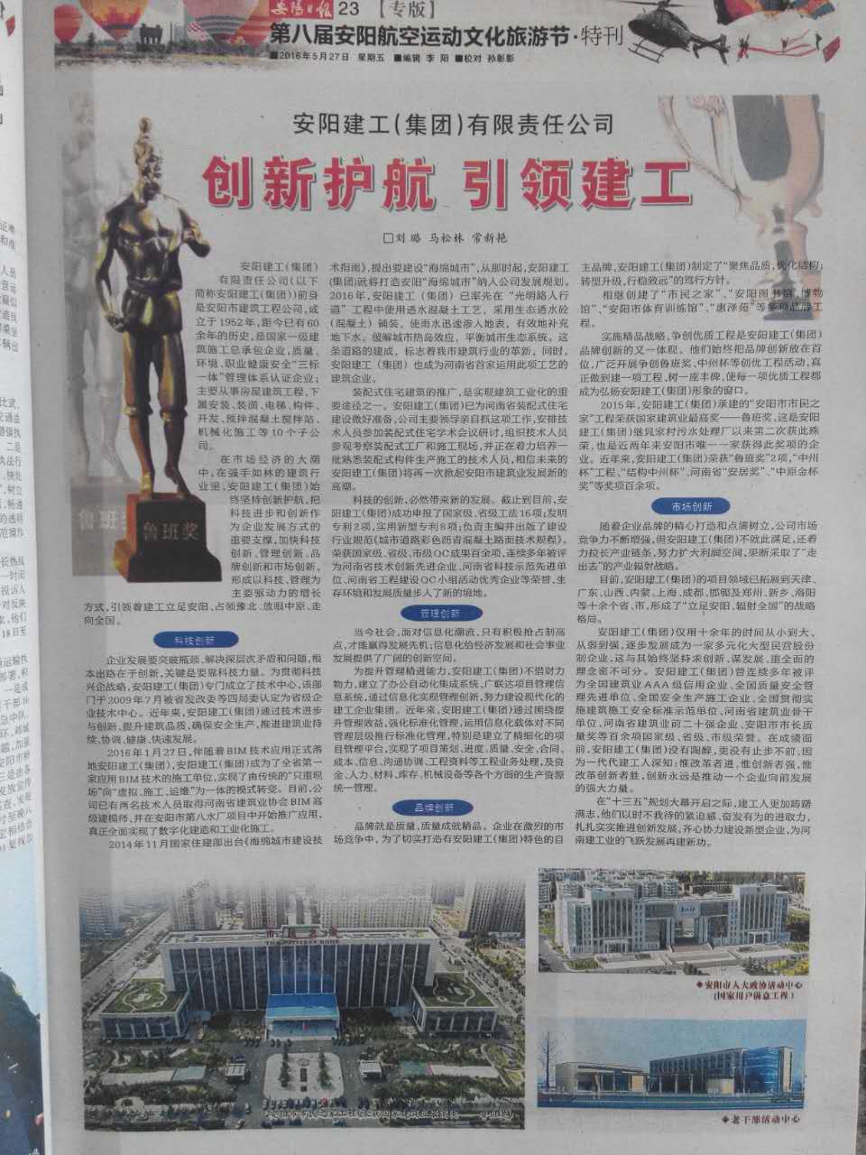 自第八屆安陽航空運動文化旅游節舉行以來,受到了社會各界的關注,這次旅游節不僅是“一場震撼身心的航空盛宴”,更是一次規格高、規模大、內容多、帶動強的形象展示。旅游節分為“飛翔”在安陽、“視聽”在安陽、“暢游”在安陽、“合作”在安陽等主題依次開展。 前不久,經市住建局推薦,集團辦公室馬松林、常新艷、劉璐寫稿的《創新護航 引領建工》榮登2016年5月27日安陽日報“第八屆安陽航空運動文化旅游節-特刊”專版。 辦公室 劉璐