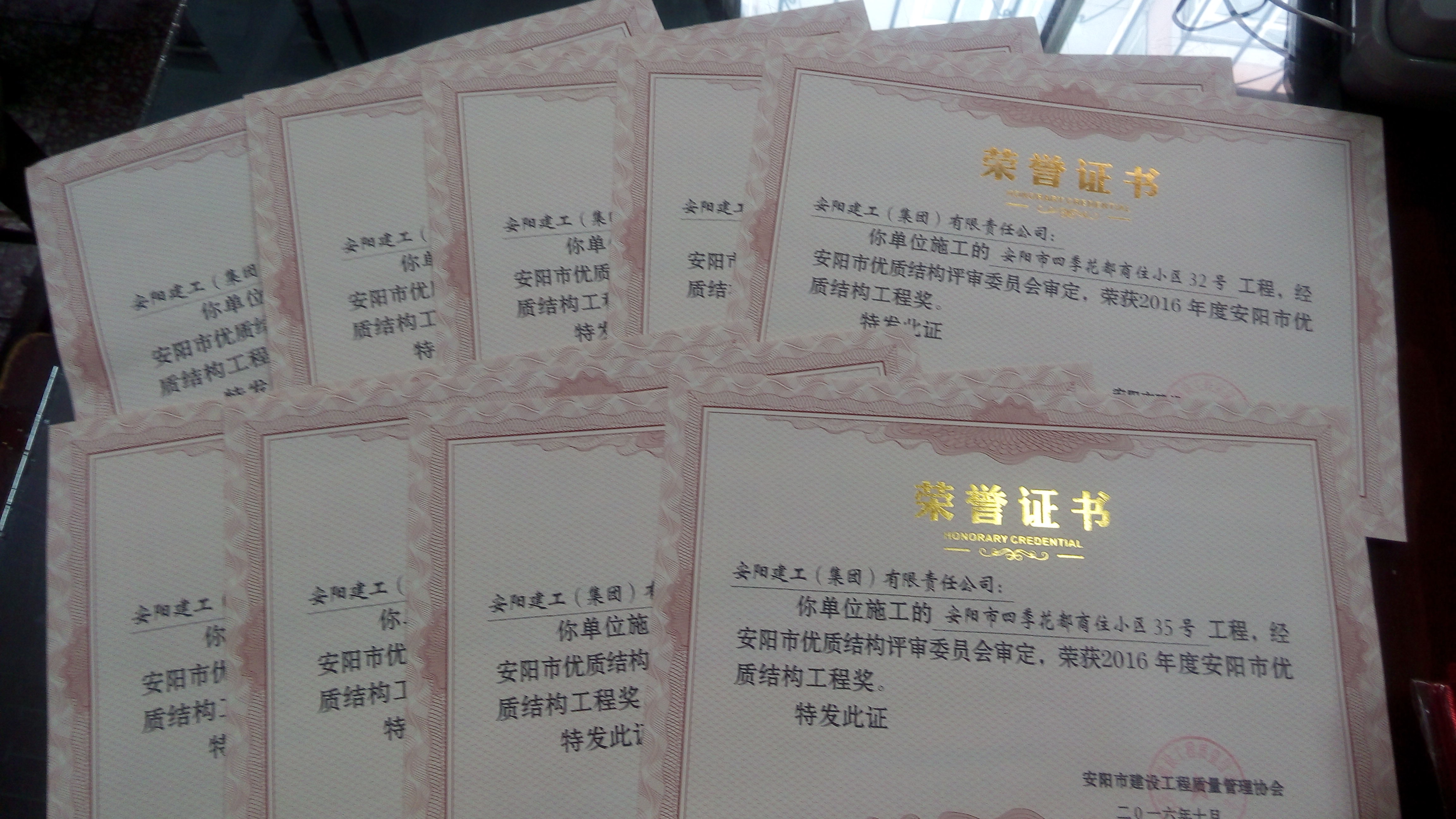 安陽市四季花都商住小區(qū)31號(hào)工程;安陽市四季花都商住小區(qū)32號(hào)工程;安陽市四季花都商住小區(qū)33號(hào)工程;安陽市四季花都商住小區(qū)34號(hào)工程;安陽市四季花都商住小區(qū)35號(hào)工程;安陽市四季花都商住小區(qū)36號(hào)工程;安陽市四季花都商住小區(qū)37號(hào)工程;安陽市飛翔學(xué)校建設(shè)(一期)項(xiàng)目工程;安陽市第八水廠工程;安陽市香山甲第2號(hào)樓;安陽市香山甲第5號(hào)樓;安陽市香山甲第6號(hào)樓;安陽市香山甲第7號(hào)樓;安陽市香山甲第8號(hào)樓等14項(xiàng)工程被評(píng)為2016年度安陽市優(yōu)質(zhì)結(jié)構(gòu)工程獎(jiǎng)。
