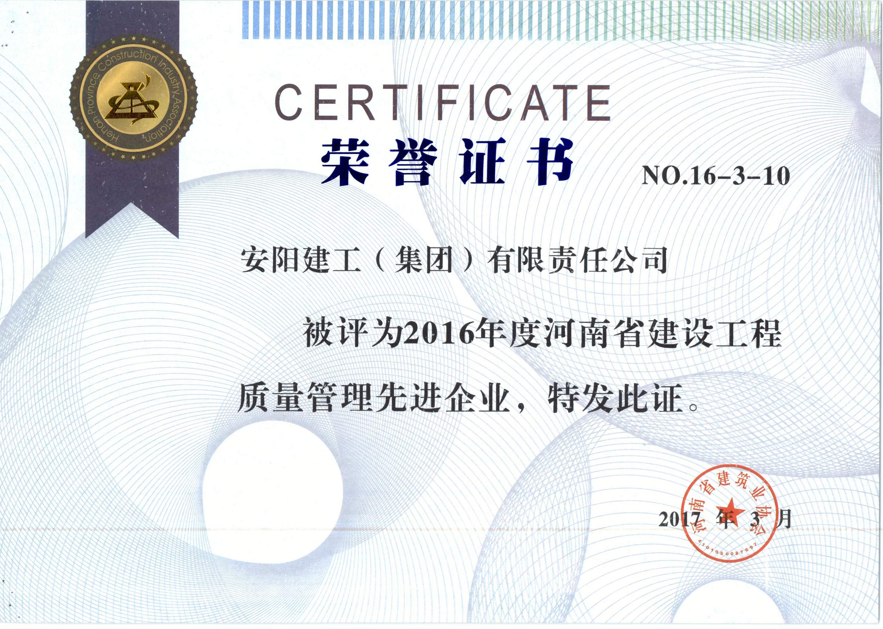 我公司被評(píng)為2016年河南省建設(shè)工程質(zhì)量管理先進(jìn)企業(yè)