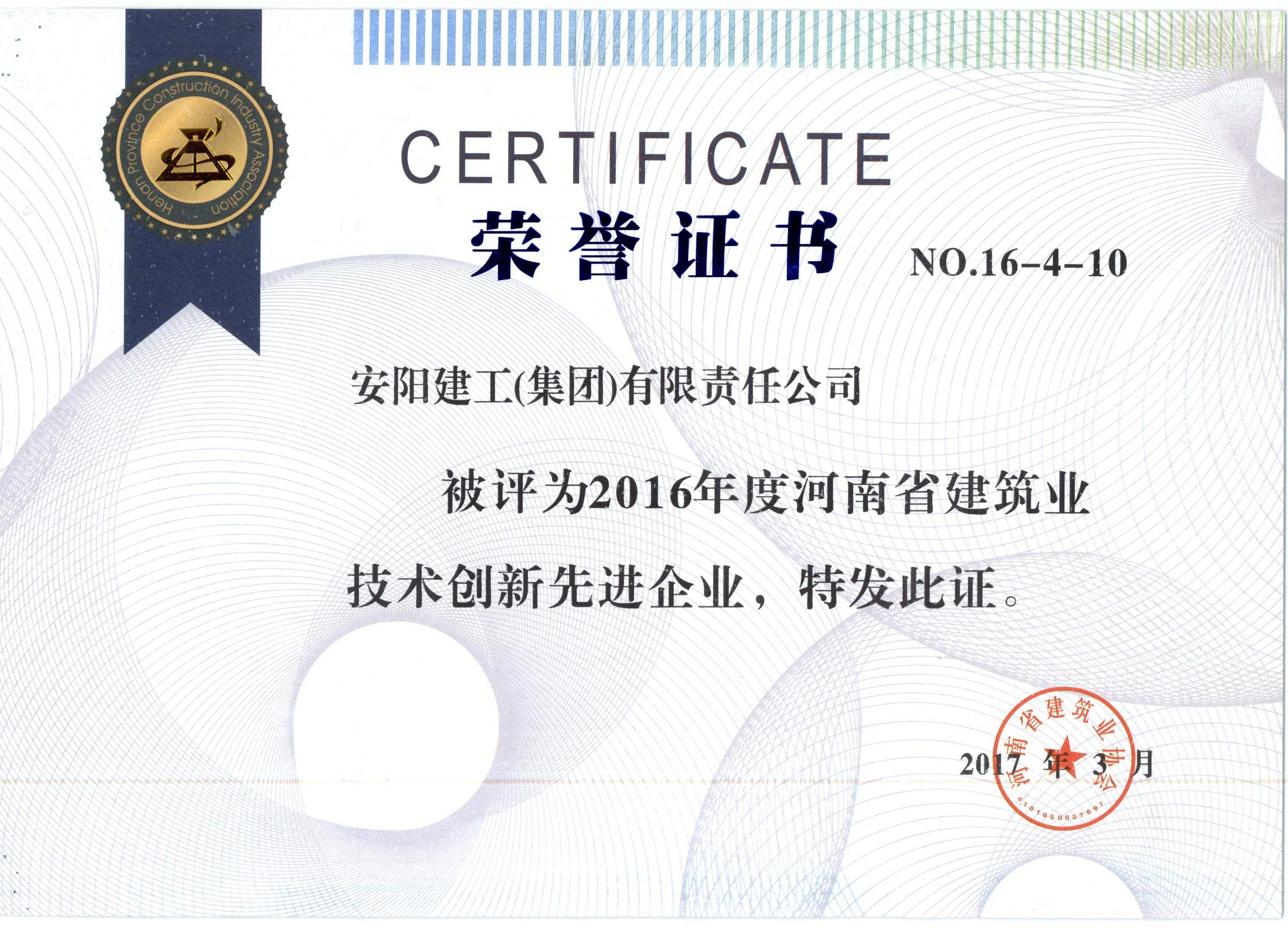 我公司被評為2016年河南省建筑業技術創新先進企業