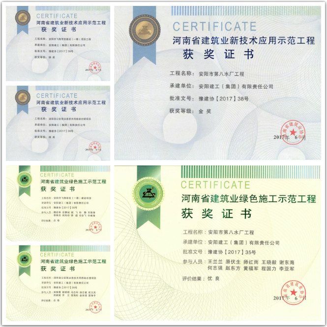 令人欣喜的是第八水廠工程榮獲“河南省建筑業新技術應用示范工程”金獎、“河南省建筑業綠色施工示范工程”優良等級,這是河南省建筑業新技術應用和綠色施工的最高獎項。
