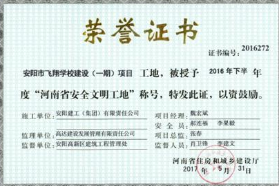 我公司承建的安陽市飛翔學校建設(一期)項目工地榮獲2016年下半年“河南省安全文明工地”稱號