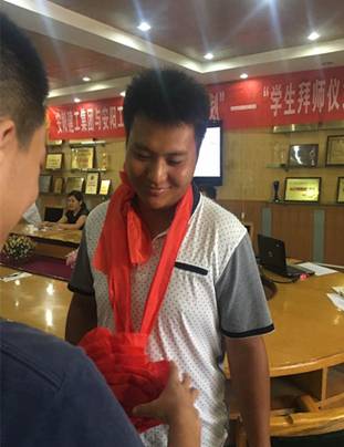 拜師儀式上,學生向自己的師傅鞠躬、敬茶,獻花,行拜師禮。指導老師代表原國瑞發言表態,“一定恪盡職守,全力教導,起到帶頭示范作用”,學生代表在隨后的發言中表示,“一定虛心請教,把師傅作為學習的楷?!?。