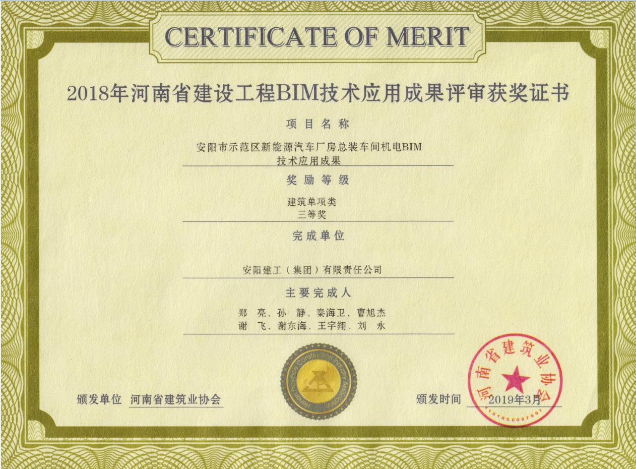 2018年河南省建設(shè)工程BIM技術(shù)應(yīng)用成果評(píng)審獲獎(jiǎng)證書。