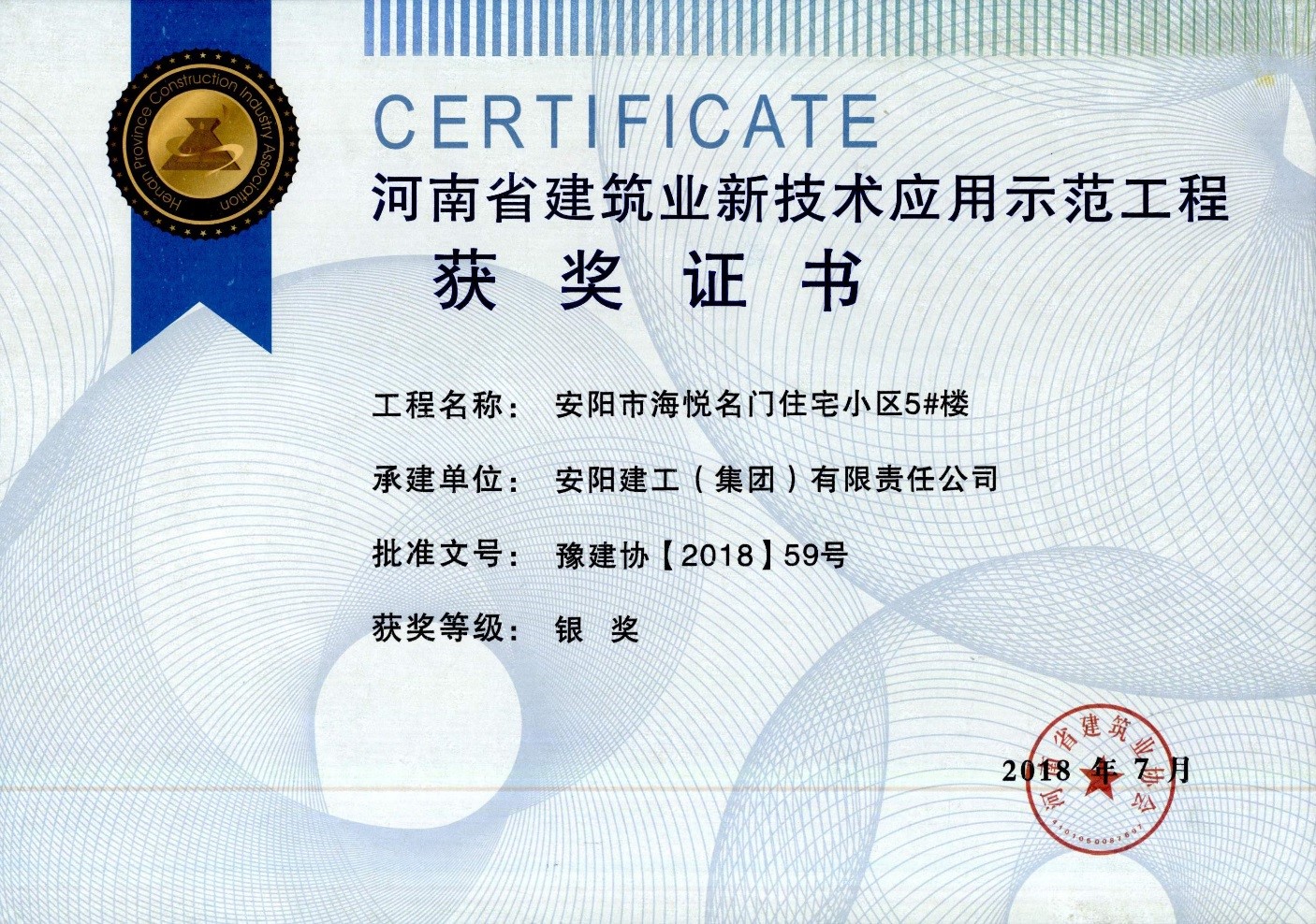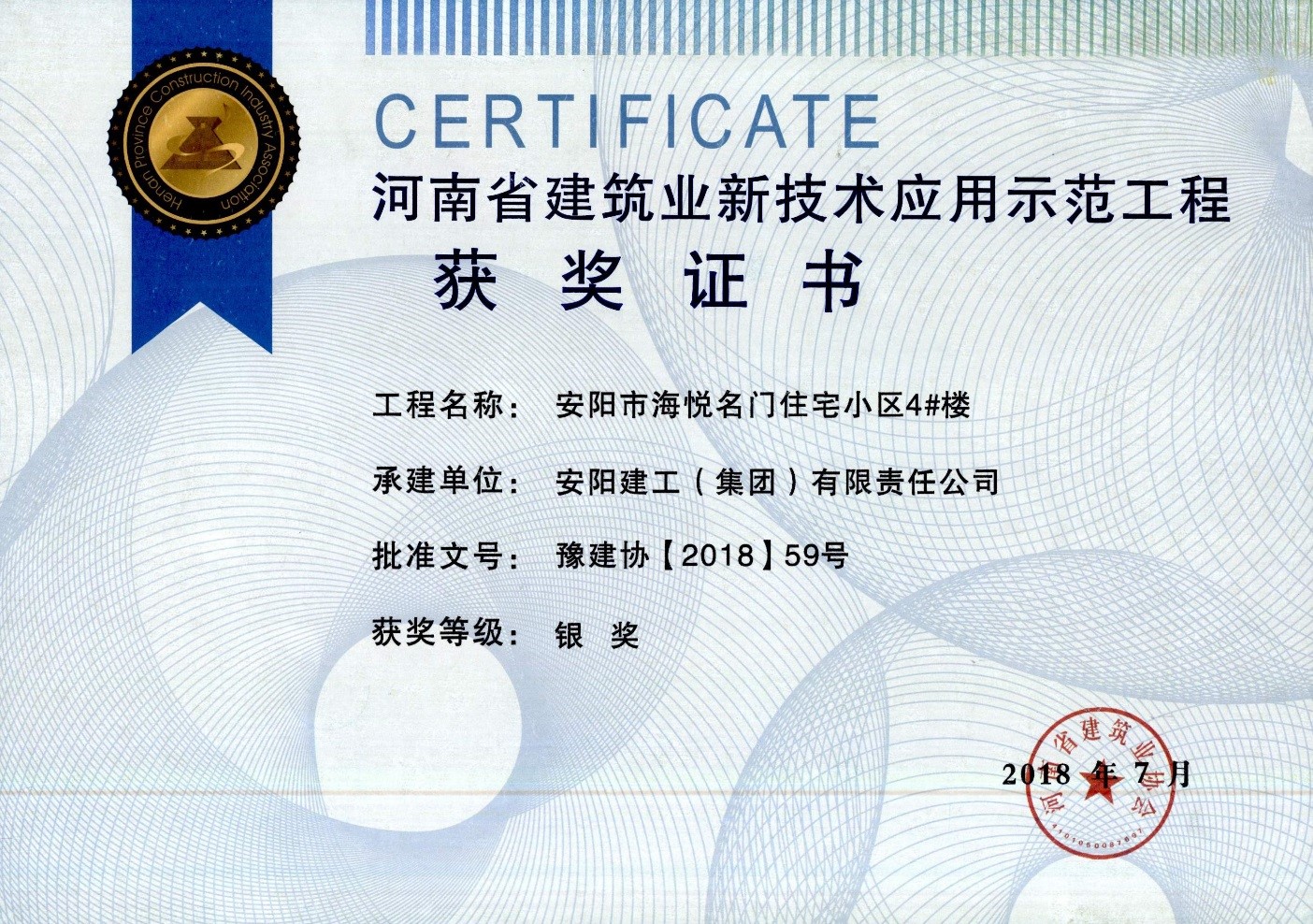 我公司安陽市海悅名門4#5#項目榮獲18年省建筑業(yè)新技術(shù)應(yīng)用示范工程