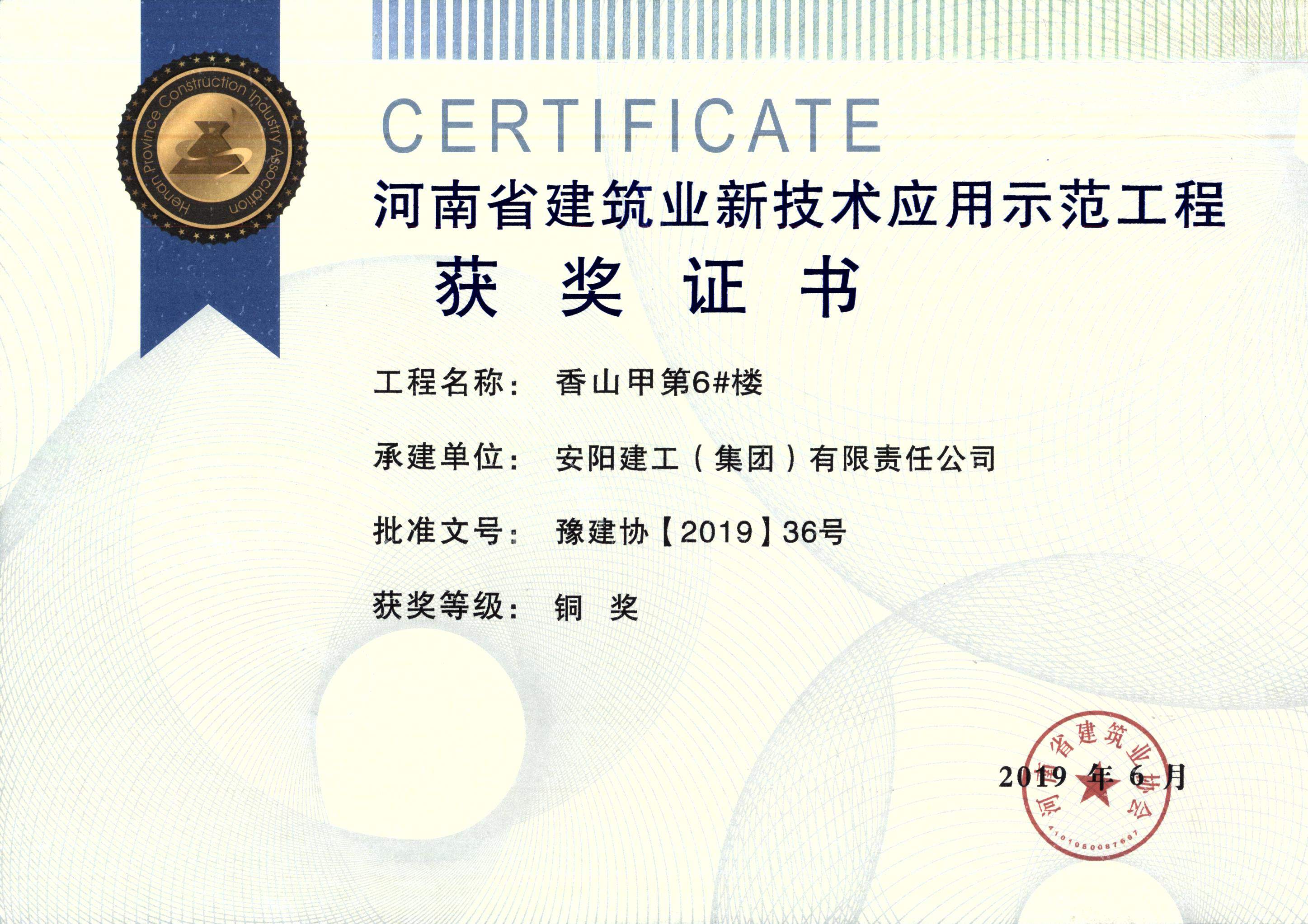 我公司香山甲第6#樓項目榮獲19年省建筑業新技術應用示范工程