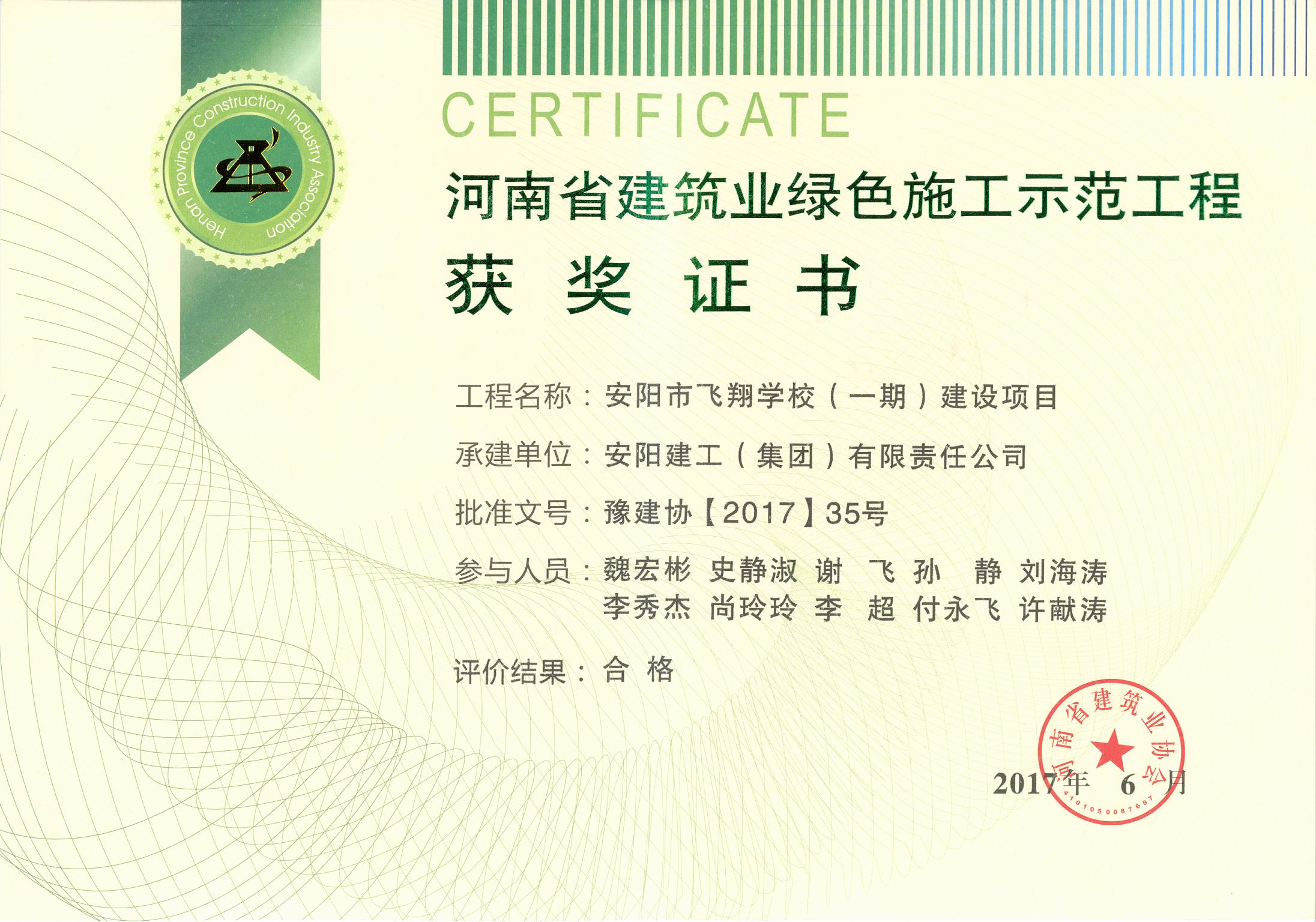 我公司安陽市飛翔學校一期項目榮獲17年省建筑業綠色施工示范工程