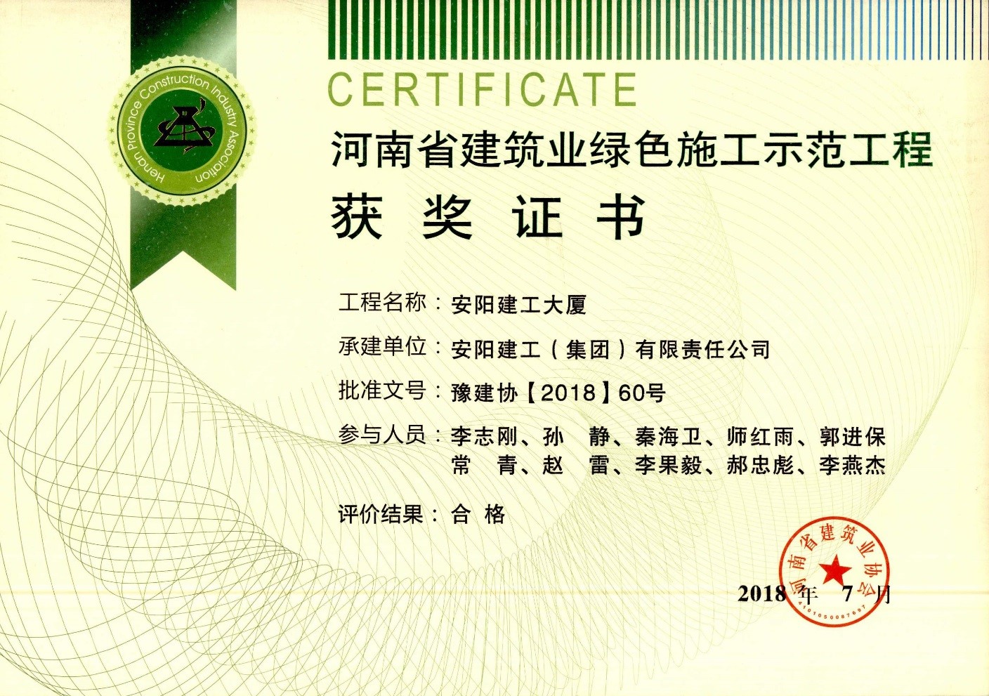 我公司安陽市建工大廈項目榮獲18年省建筑業(yè)綠色施工示范工程