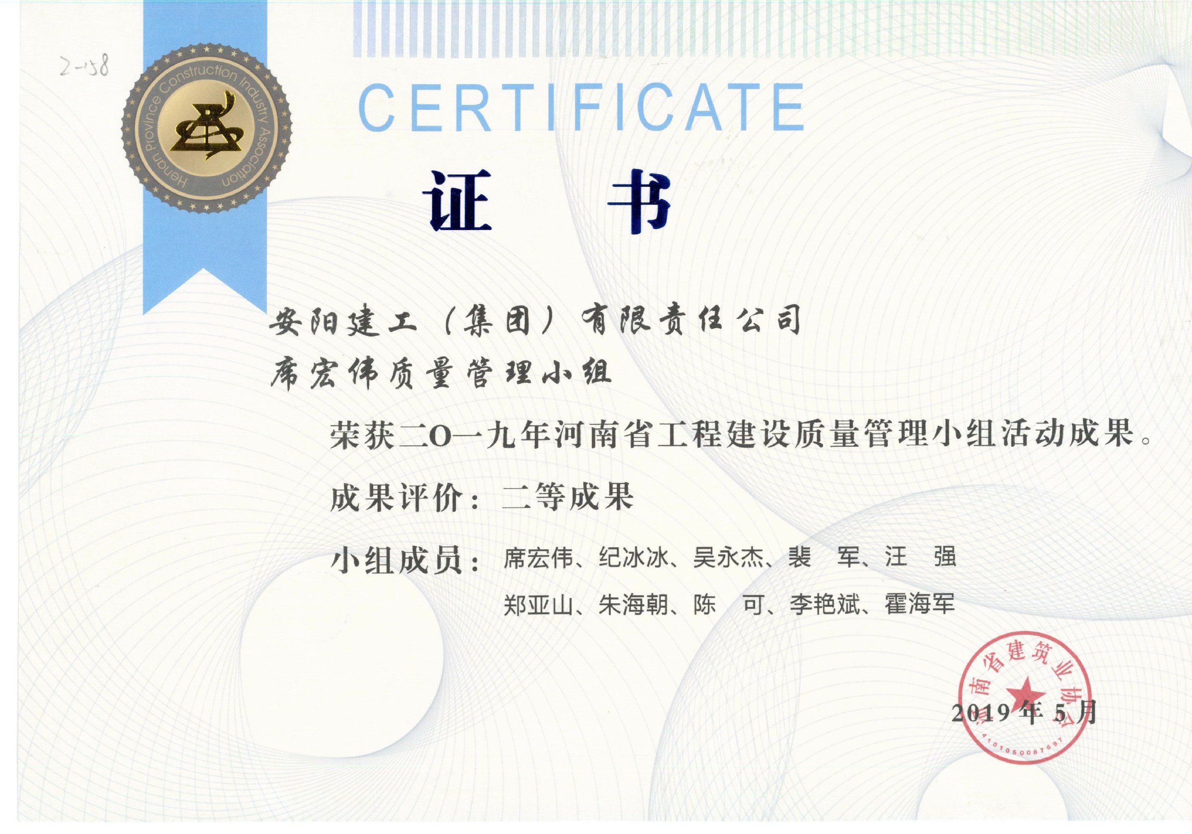 我公司席宏偉QC小組榮獲2019年河南省工程建設QC小組活動成果二等獎