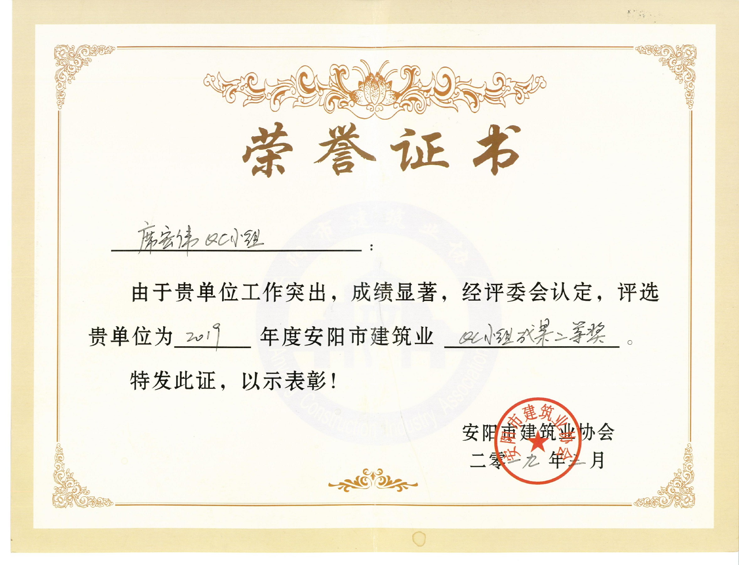 我公司席宏偉QC小組榮獲2019年安陽市建筑業QC小組成果二等獎