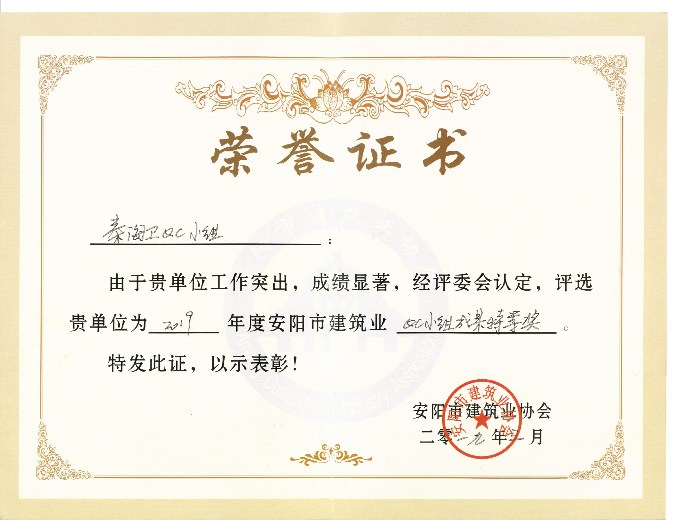 我公司秦海衛(wèi)QC小組榮獲2019年安陽市建筑業(yè)QC小組成果特等獎