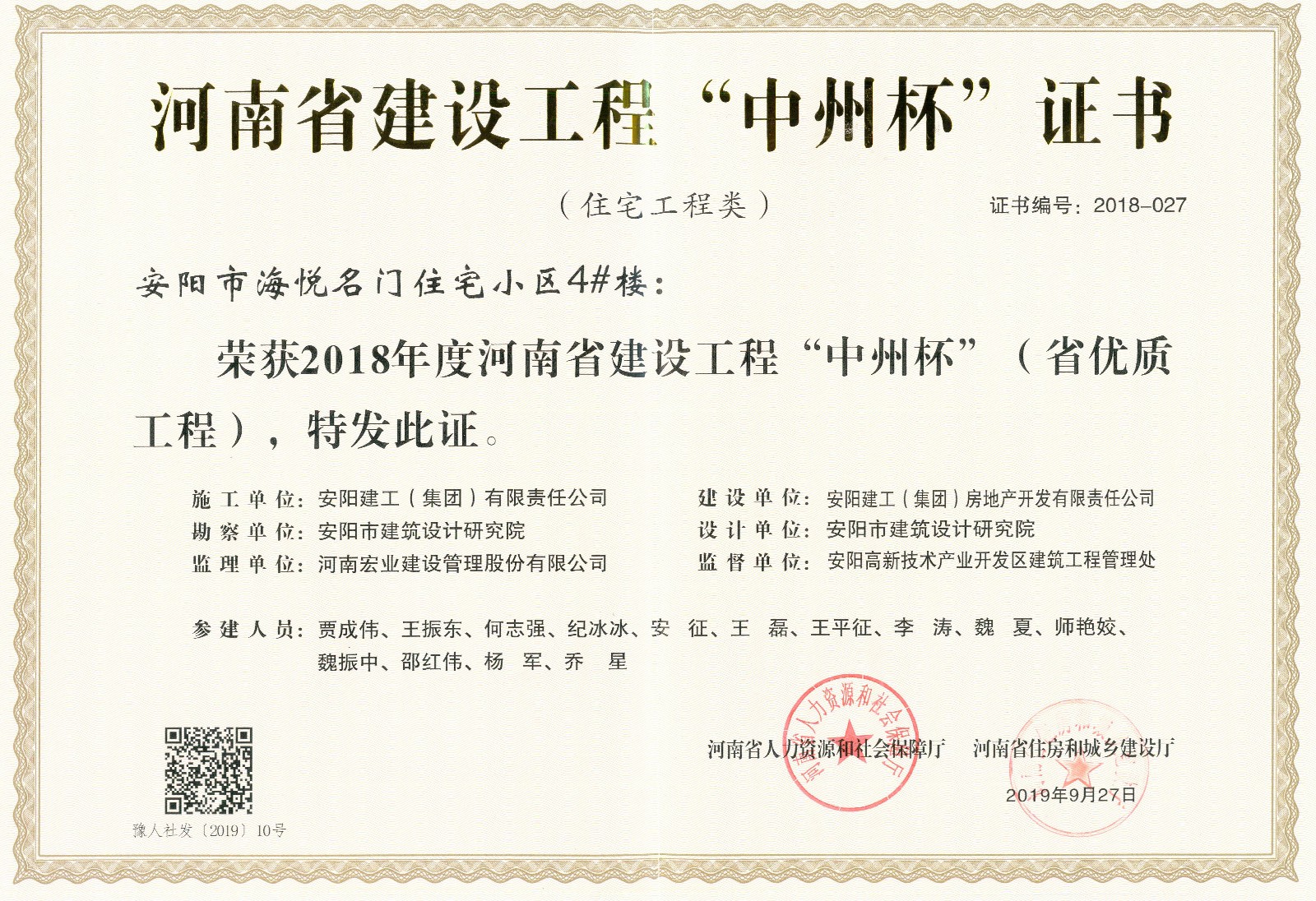 我公司承建的安陽市海悅名門4#5#樓項目榮獲2018年度河南省建設工程中州杯獎
