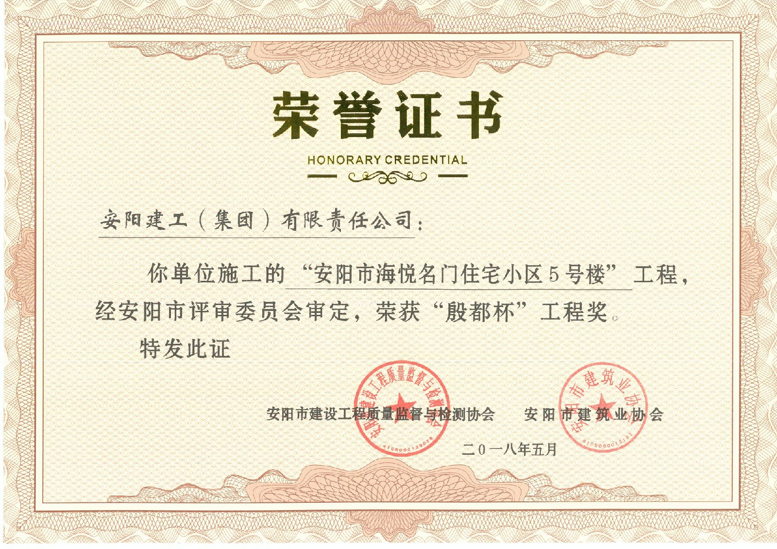 我公司承建的安陽市海悅名門4#5#樓項目榮獲2018年度安陽市殷都杯工程獎