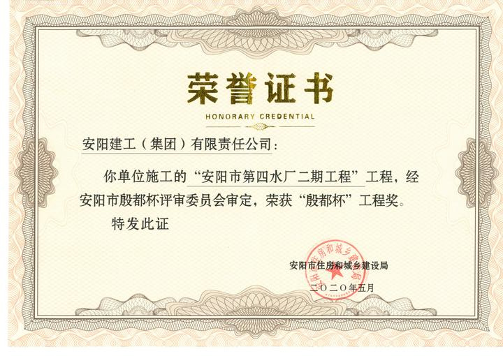 我公司承建的安陽市第四水廠二期項目榮獲2020年度安陽市殷都杯工程獎