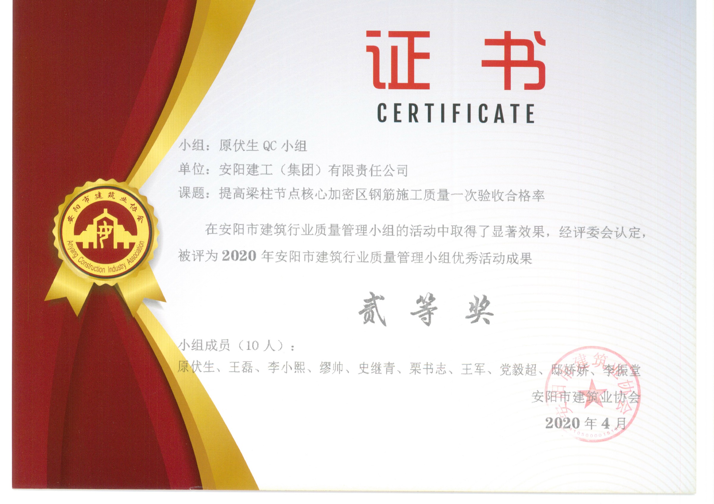 我公司原伏生QC小組榮獲2020年安陽市建筑行業(yè)QC小組成果二等獎(jiǎng)