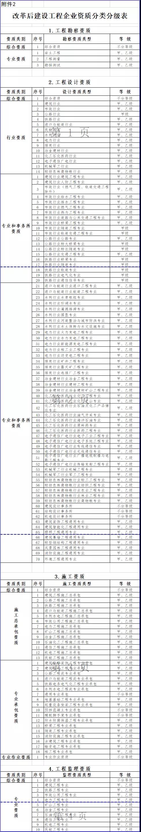 2.工程設計資質。保留綜合資質;將21類行業資質整合為14類行業資質;將151類專業資質、8類專項資質、3類事務所資質整合為70類專業和事務所資質。綜合資質、事務所資質不分等級;行業資質、專業資質等級原則上壓減為甲、乙兩級(部分資質只設甲級)。