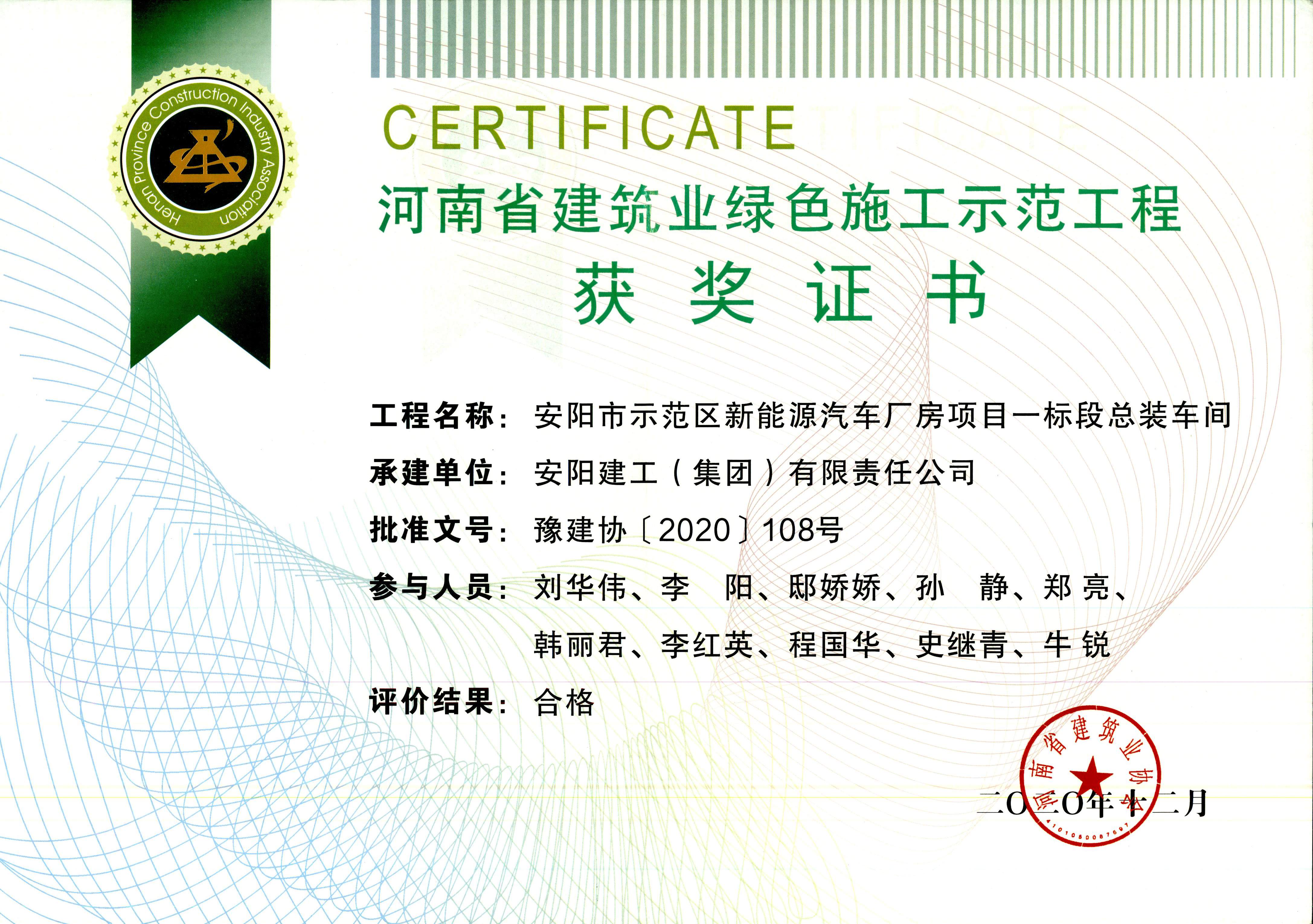 我公司安陽市示范區新能源汽車廠房項目一標段總裝車間榮獲河南省建筑業綠色施工示范工程