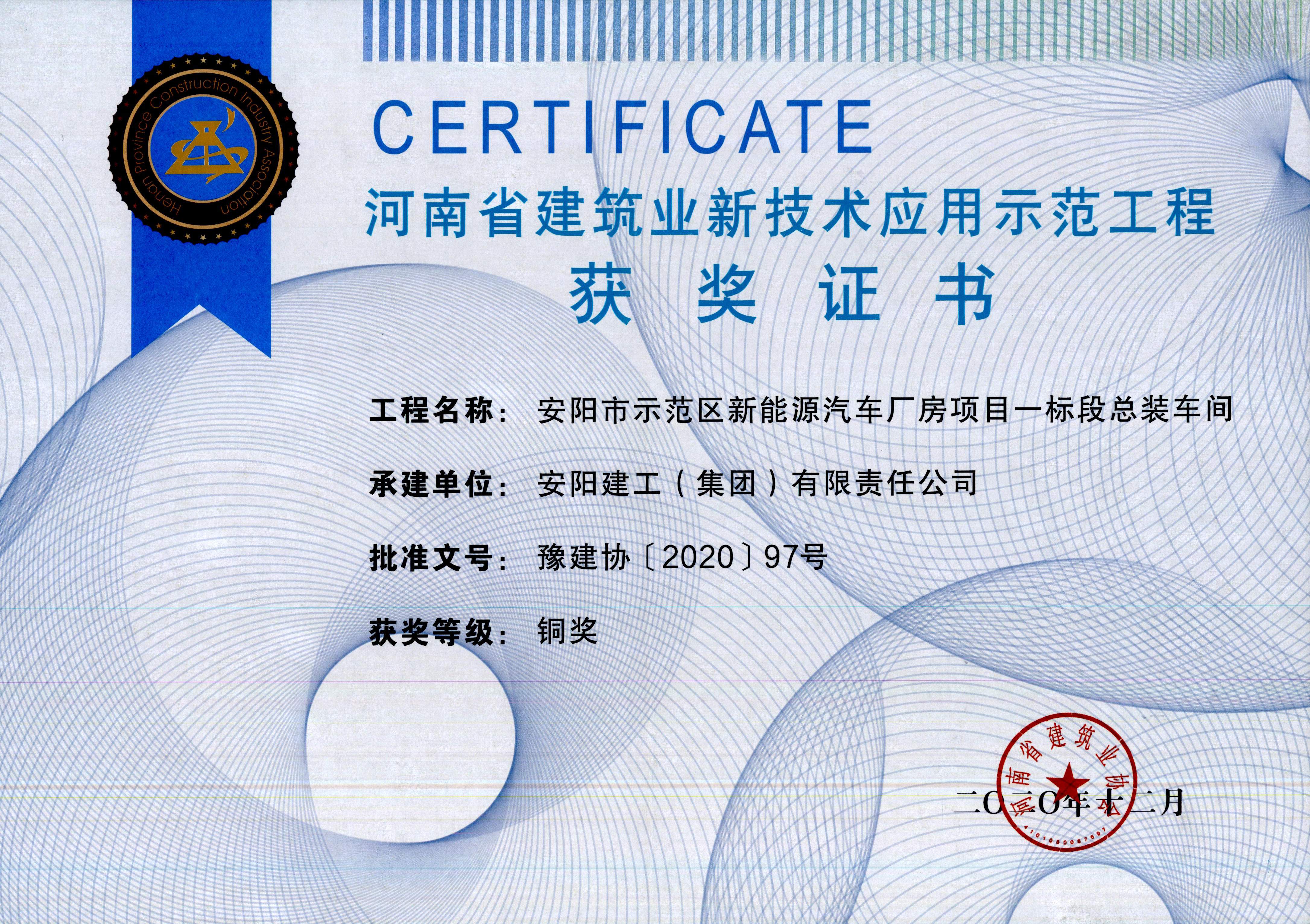 我公司安陽市示范區新能源汽車廠房項目一標段總裝車間榮獲河南省建筑業新技術應用范工程