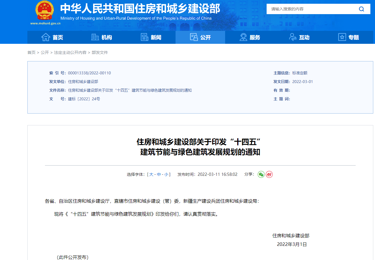 近日,住房和城鄉建設部發布《關于印發“十四五” 建筑節能與綠色建筑發展規劃的通知》。