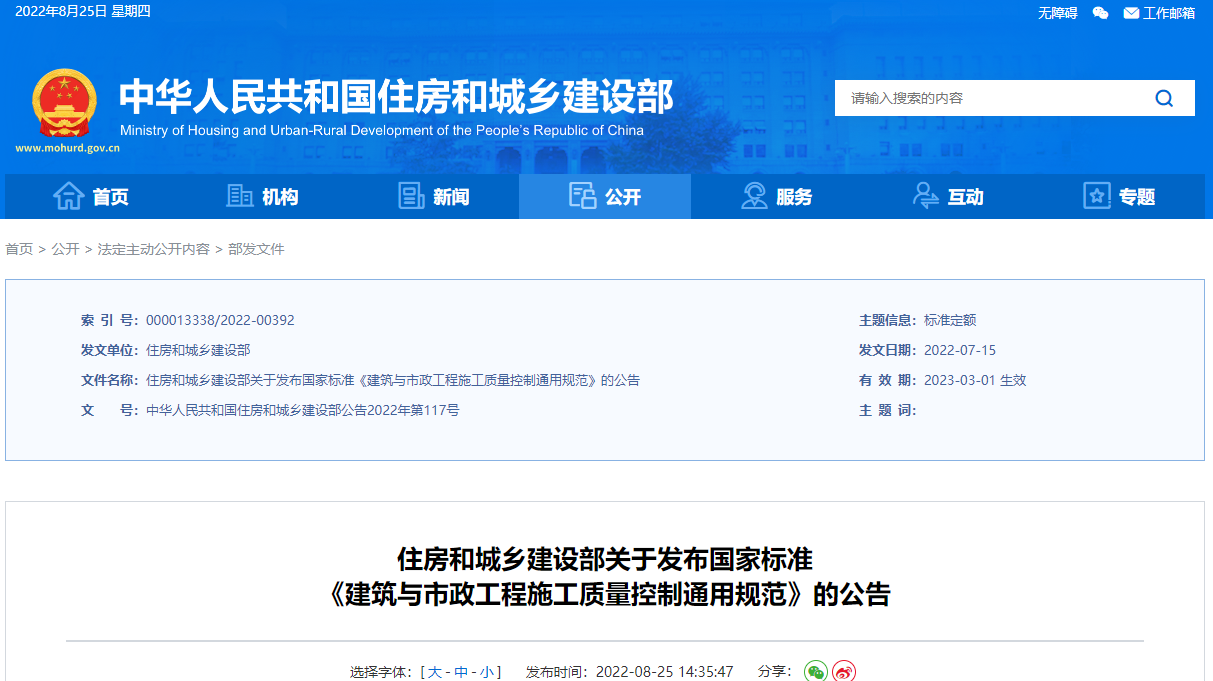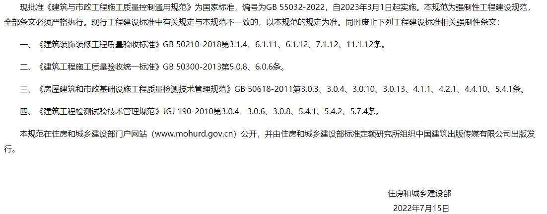 原文鏈接及附件下載:住房和城鄉建設部關于發布國家標準 《建筑與市政工程施工質量控制通用規范》的公告 https://www.mohurd.gov.cn/gongkai/fdzdgknr/zfhcxjsbwj/202208/20220825_767714.html