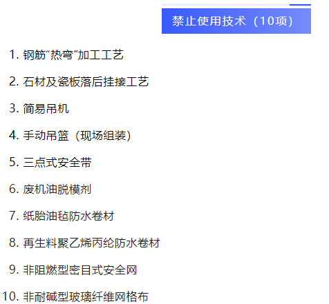 近日,住建部官網(wǎng)發(fā)布《關于《房屋市政工程禁止和限制使用技術目錄(2022年版)(征求意見稿)》公開征求意見的通知》,簡易吊機、鋼筋“熱彎”加工工藝、三點式安全帶等10項技術擬被禁止使用。輪扣式腳手架、支撐架、扣件式鋼管卸料平臺、鋼管扣件型附著式升降腳手架等16項技術擬被限制使用。