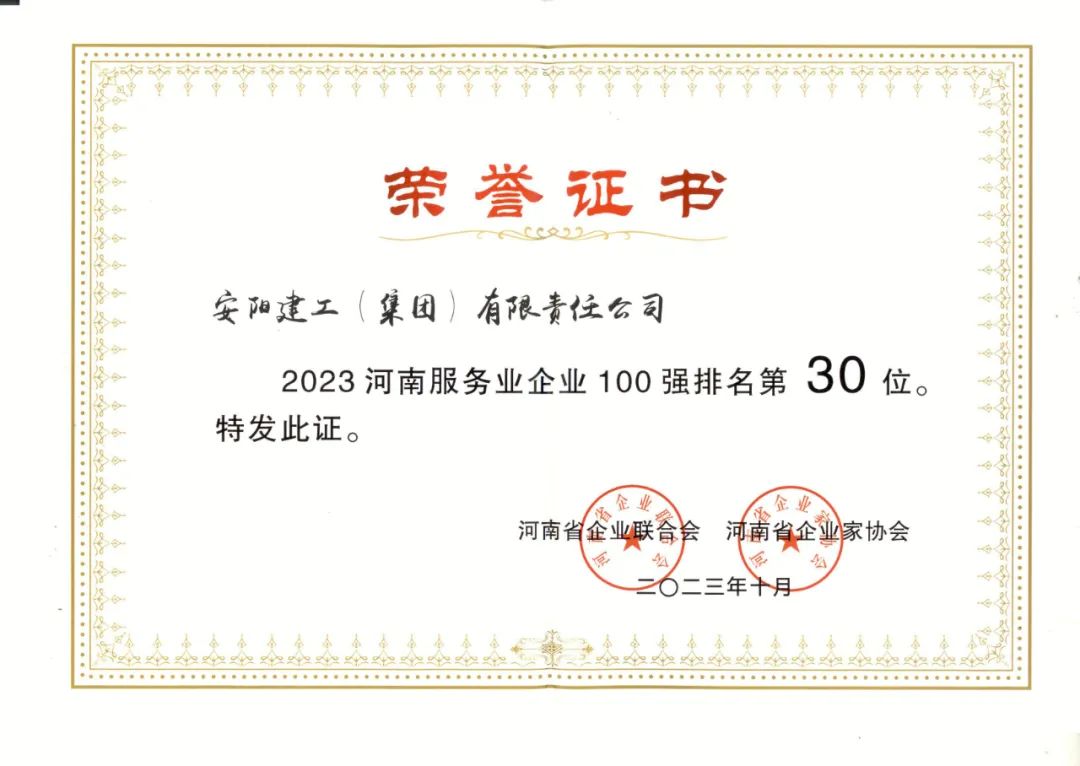 近日,河南省企業聯合會、河南省企業家協會聯合發布2023河南企業100強、2023河南制造業企業100強、2023河南服務業企業100強榜單,我集團公司再次喜獲2023河南服務業企業100強榮譽!