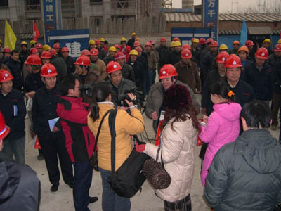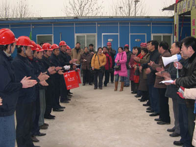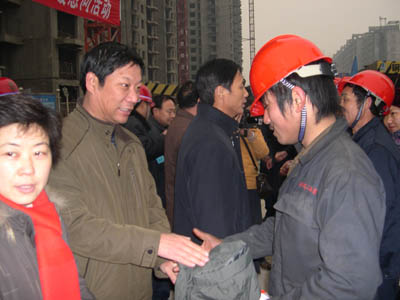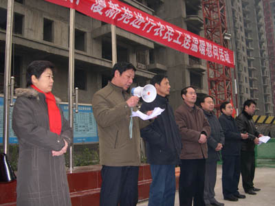 2008年1月10日是一個(gè)普通的日子,但對(duì)于建工(集團(tuán))廣廈工地上的農(nóng)民工來(lái)說(shuō)卻是難忘的一天。這一天天氣格外寒冷,氣溫驟降給建筑工人戶外作業(yè)增加了勞動(dòng)難度和強(qiáng)度。安陽(yáng)建工(集團(tuán))各建筑工地上的工人師傅們和往常一樣仍堅(jiān)守在各自的工作崗位上,依然認(rèn)真工作、辛勤勞動(dòng)著,他們絲毫沒(méi)有因?yàn)橥獠織l件艱苦而影響了工作。安陽(yáng)市總工會(huì)主席聶孟磊、副主席陰春生、保障部部長(zhǎng)呂啟霞 、城建水利工會(huì)主席陳亮等一行在這一天帶著100件羽絨服、100本《農(nóng)民工知識(shí)讀本》和對(duì)廣大農(nóng)民工的一片關(guān)愛(ài)來(lái)到了廣廈新苑工地,為那里的農(nóng)民工送去了溫暖。公司領(lǐng)導(dǎo)謝海如、馬松林、鐘新安及市機(jī)關(guān)事務(wù)管理局廣廈新苑指揮部人員參加了這次送溫暖活動(dòng)。公司黨委副書記、工會(huì)主席馬松林主持儀式。