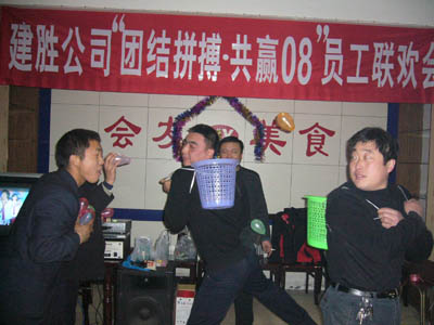 公司副經理董建新為公司的興旺發達、員工的健康、家庭和睦而干杯的提議拉開了聯歡會的帷幕。溜光溢彩,歡聲一片。小游戲,文藝節目穿插互動。其中投籃趣味性較強,背藍的員工必須走動,而投藍手拿的是輕飄的氣球,難度較大;看表情猜飲料要求兩名員工一組,一個喝貌似相同的飲料,另一個從他瞬間表現猜喝的什么飲料,這不光需要相互間配合的默切,更需要判斷力,假如要加深對成語張冠李戴的理解,這也算得上是不錯的課堂。