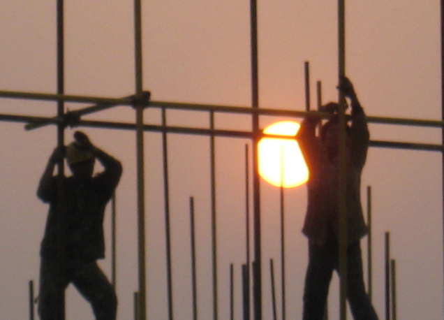 安陽建工集團承建的新鄉博物院工程是新鄉市的重點工程項目,建成后是一座用于服務公眾、傳承文化、展示形象的標志性建筑。為了工程的順利建成,從2007年11月5日開工以來,我們舉全公司之力,從建設最高的質量出發,調動了最好的技術人員,一流的施工設備和經驗豐富的施工隊伍,投入了大量的人、財、物等各種資源,全力投入到了為新鄉市的重點工程建設之中。目前該該工程進入主體一層收尾階段,當前正值春暖花開,為了抓住這大好的施工季節,趕工期、保質量,新鄉博物院項目部全體員工正在夜以繼日、加班加點的緊張施工,他們正在用辛勤的汗水編織美好的明天。(圖為職工在夕陽的映襯下搭設腳手架)