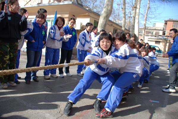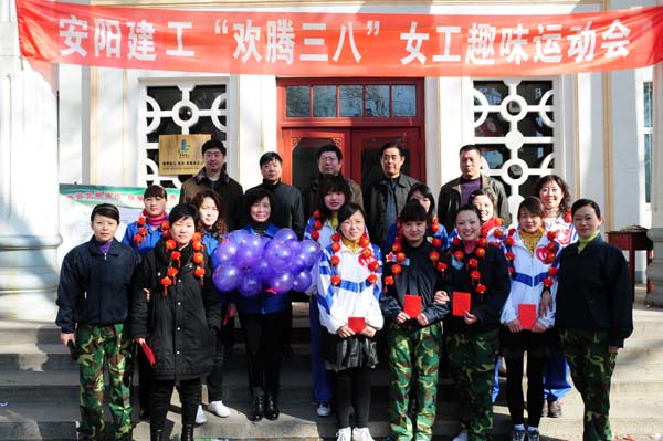 運動會共設有個人項目和團體比賽項目,每個項目分兩輪進行比賽,第一個進行的“快樂呼啦圈”是個人參賽項目,分別由紅隊的紀敏和藍隊的徐萌獲勝;“鳳凰歸巢”是團體項目,要求一名隊員手持筐,另一名隊員在指定位置把毽子投入筐中,你可別小看這空中飛毽,沒有一定的準頭還真扔不進去;接下來的“手足情深、蜈蚣競走”、“接力賽”和“心心相印”也都是團體項目,需要隊員相互的配合才能完成,比賽過程緊張激烈,妙趣橫生,各隊選手是奮進齊驅,一爭上下;最后進行的拔河比賽更是扣動人心,要求各隊的隊長必須要參加,先抽簽進行第一輪4進2,再2進1,三局兩勝定勝負,各隊派10名隊員參加,隨著裁判的一聲哨響,長繩兩旁的隊員們開始奮力的拉繩,啦啦隊員的加油聲更是激奮了動力和斗志,最后,紅隊一舉獲勝,不僅贏取了這個比賽項目的獲勝獎,也是所有比賽項目中獲勝最多的一隊。頒獎儀式由工會主席馬松林主持,公司領導親自為獲獎選手頒獎并合影留念,三八趣味運動會在美妙的音樂和歡慶的舞蹈中圓滿的畫上了尾聲。