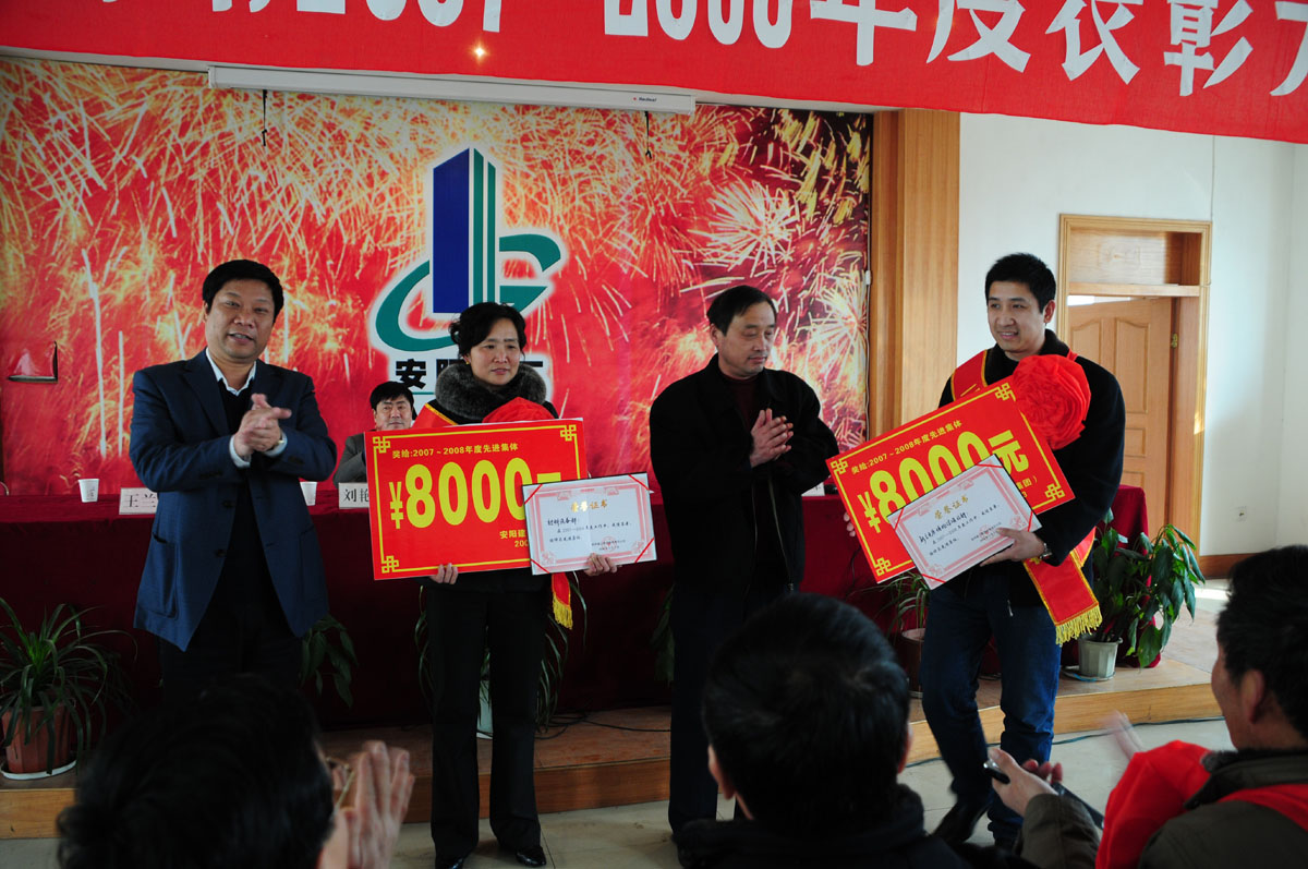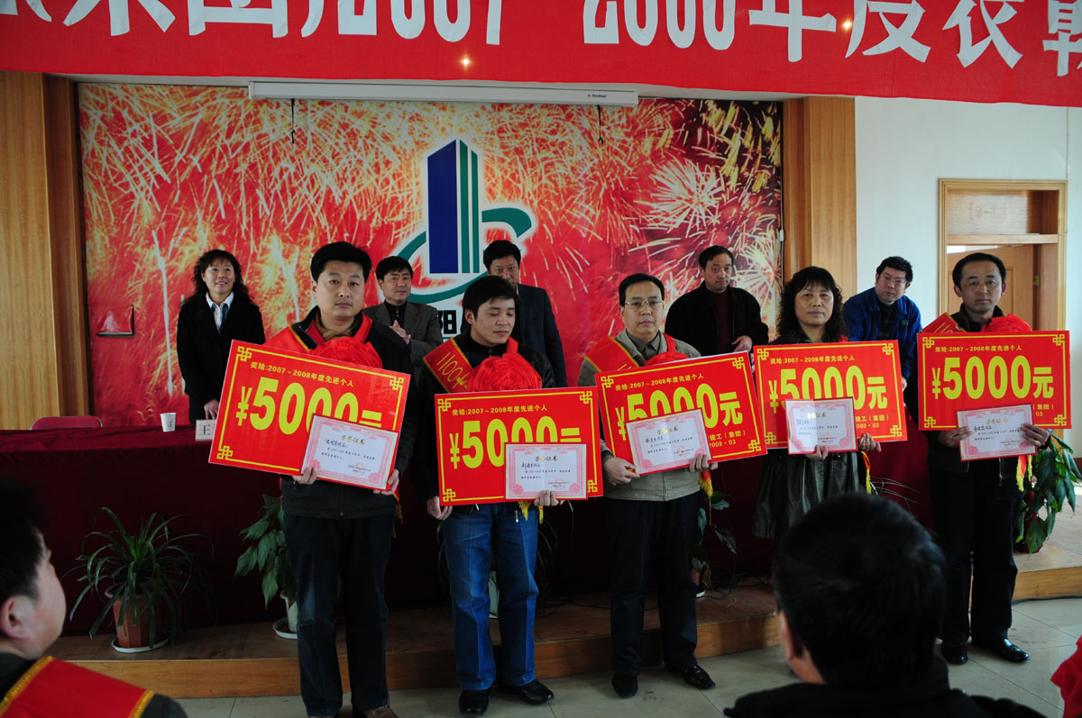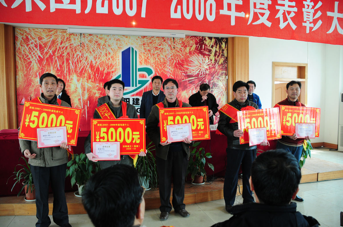 三點時分,大會在嘹亮的《國歌》聲中拉開序幕,公司副總經理郝志峰同志宣讀表彰決定, 決定對在2007——2008年度涌現出的新鄉博物院項目部等兩個先進集體和肖愛亭等十名先進個人予以通報表彰。在歡快的樂曲聲中,公司領導為先進集體及先進個人頒發榮譽證書并分別給予先進集體8000元、先進個人5000元的獎勵,兩個先進集體代表和十名先進個人代表披紅掛花,上臺領獎,整個大會場面既隆重又熱烈。