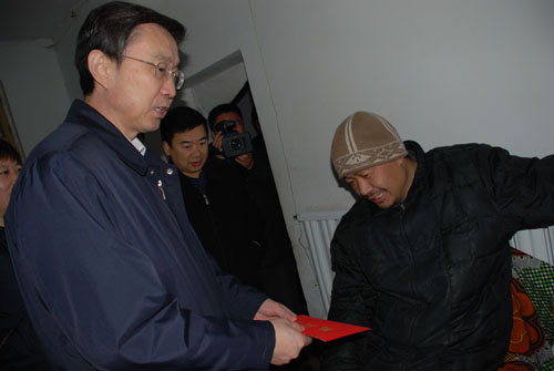 市領導與梁躍河家人親切交談、噓寒問暖,詳細詢問了梁躍河的家庭生活情況。當得知作為家庭頂梁柱的梁躍河因腦出血多年偏癱,生活不能自理,愛人下崗,兒子在上高中,老母親也患有心臟病,生活十分困難時,李書記鼓勵他們要樹立生活的信心,勇敢面對眼前的困難,相信在黨和政府的幫助下,生活困難會逐漸得到解決,日子也會一天天地好起來,并囑咐在場的隨行人員,要采取措施,盡力幫助他們,讓他們過一個歡樂、祥和的春節。當接過飽含全市人民關懷與溫暖的慰問金時,因病不能說話的梁躍河流下了感動的淚水,其老母親激動的說:感謝黨和政府,感謝市領導、工會領導冒著嚴寒來看我們!